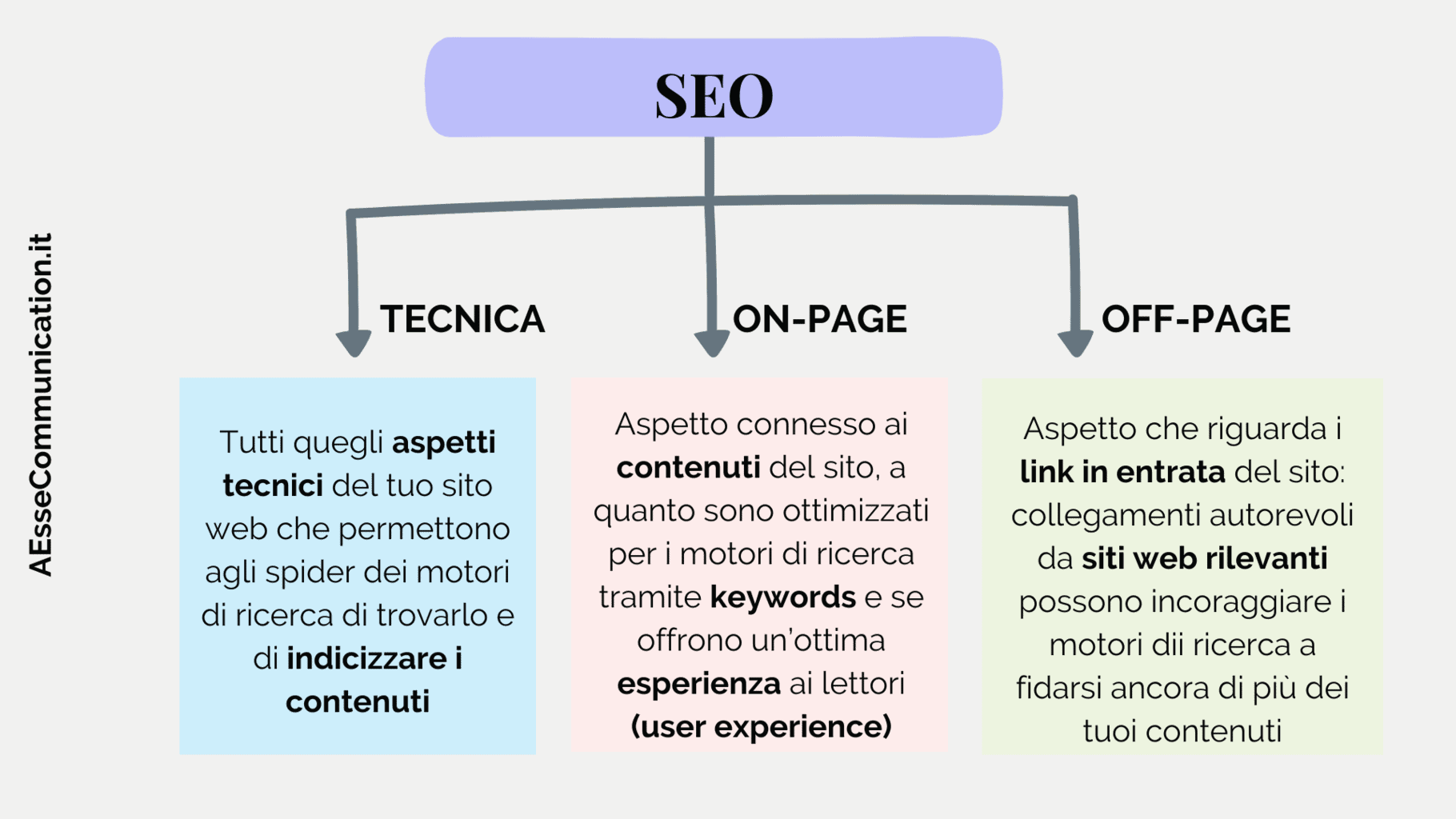 Lo schema qui sotto riassume a grandi linee i tre aspetti principali della SEO: come puoi vedere i nostri contenuti SEO-Friendly si inseriscono tra le pratiche di SEO-on page.